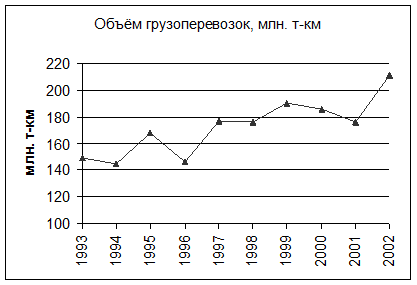 Средний абсолютный прирост цепной составил 6,89 млн.т-км., таким образом объём перевозок в 2002 году будет 217,89 млн. т-км, а в 2003 году примерно 224,78 млн.т-км., а в 2004 году объём перевозок будет равен примерно 231,67 млн.т-км.