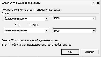 Заполнение диалогового окна Пользовательский автофильтр согласно рис. 3.