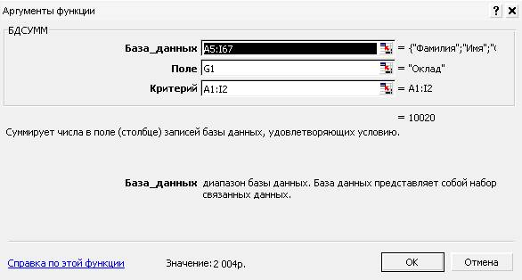где G1 – ячейка имени поля с арифметическими значениями – окладами, используемыми для подсчета числа записей, удовлетворяющих условиям фильтрации.