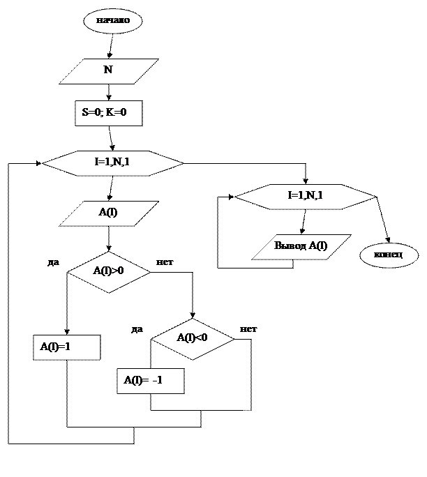 В массиве A(N) все отрицательные элементы заменить на -1, а все положительные элементы заменить на 1.