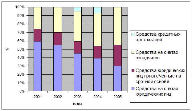 Банк продолжает проводить политику формирования ресурсной базы, позволяющей реализовывать кредитование реального сектора экономики на долгосрочной основе. Углубляется тенденция более высоких темпов роста объемов привлечения средств клиентов на срочной основе. В 2005 году портфель срочных депозитов, векселей и вкладов увеличился практически в два раза, в 2004 году темпы роста составляли 70%.