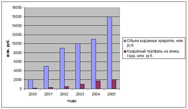 Темпы роста портфеля кредитов составили 44%. В традиционной структуре вложений среди тенденций года можно отметить наращивание объемов потребительского кредитования. В 2005 году они выросли в 3 раза (с 43 до 130 млн.рублей).