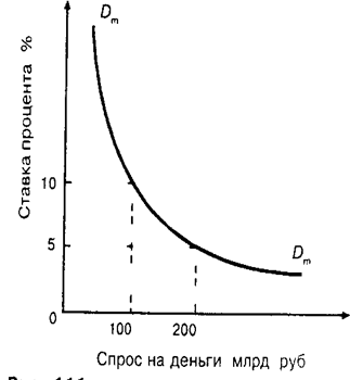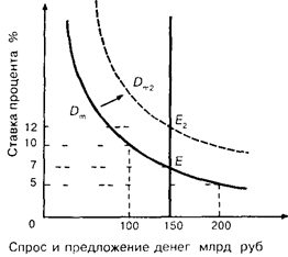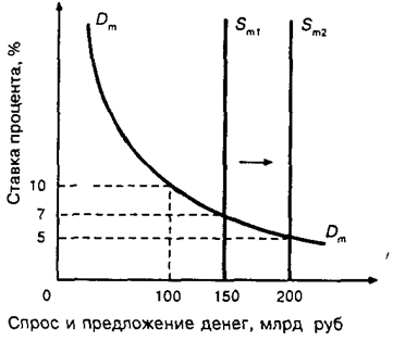 На рис. 2 приведены типичные кривые спроса и предложения денег. Кривая предложения Sm имеет форму вертикальной прямой при допущении, что центральный банк, контролирующий денежное предложение, стремится поддерживать его на фиксированном уровне независимо от изменении номинальной процентной ставки. Как и на любом рынке, равновесие на денежном рынке имеет место в точке пересечения кривых спроса и предложения.