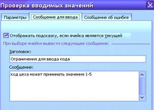 · выберем закладку «Сообщение для ввода» (если мы хотим видеть подсказку об ограничениях ввода в выбранную ячейку) и введем информацию, представленную на рис. 3.