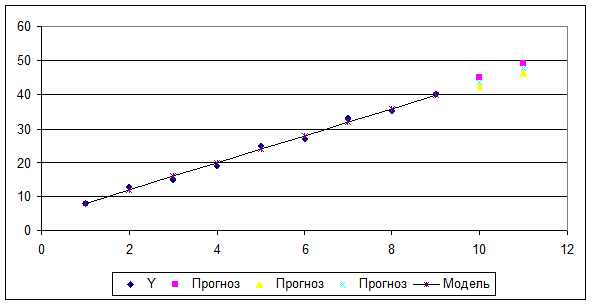 Рассчитаем прогнозные значения для 10 и 11 недели, подставив соответствующие значения в ранее полученное уравнение регрессии