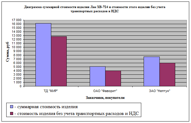 3. Построить столбиковую диаграмму суммарной стоимости одного вида изделия (любого) и стоимости этого изделия без учета транспортных расходов и НДС.