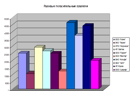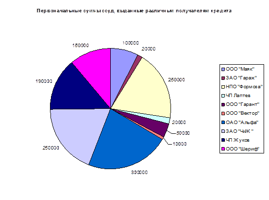 2. Построить диаграмму первоначальных сумм ссуды, выданных различным получателям кредита (круговая диаграмма) и величины разового погасительного платежа для различных получателей кредита (объемная гистограмма).