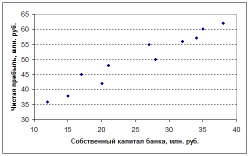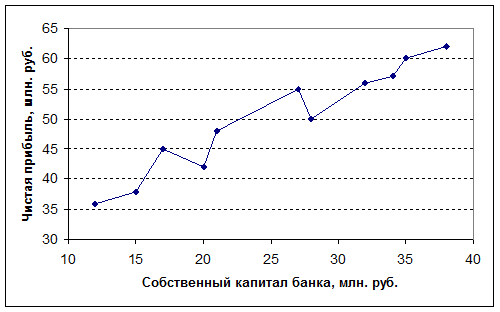 Анализируя аналитическую группировку (таблица 3), можно заметить, что при переходе от одной группы к другой, вслед за увеличением размера чистых активов среднее значение прибыли банков возрастает. Следовательно, между данными признаками существует прямая корреляционная связь.