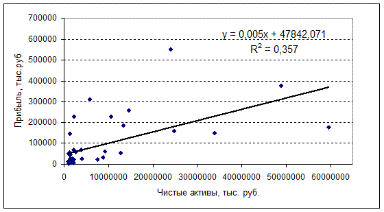 Рис.1. Зависимость прибыли банков о величины чистых активов