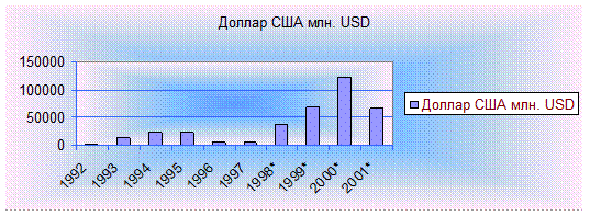 4. Используя данные таблицы «Динамика объемов продаж на биржевых торгах ММВБ» из раздела Статистика по годам, постройте график, показывающий динамику объемов продаж доллара США (в мил USD) на торгах за 1992-2001гг.