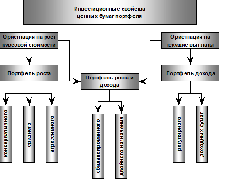Выделяют два основных типа портфеля: портфель, ориентированный на преимущественное получение дохода за счет процентов и дивидендов (портфель дохода); портфель, направленный на преимущественный прирост курсовой стоимости входящих в него инвестиционных ценностей (портфель роста). Было бы упрощенным понимание портфеля как некой однородной совокупности, несмотря на то, что портфель роста, например, ориентирован на акции, инвестиционной характеристикой которых является рост курсовой стоимости. В его состав могут входить и ценные бумаги с иными инвестиционными свойствами. Таким образом, рассматривают еще и портфель роста и дохода.