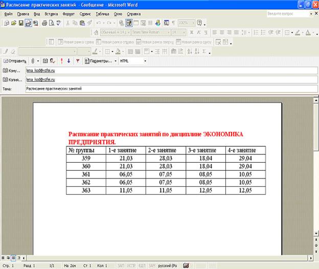 Используя электронную почту, выполнить операции по отправке сообщения о расписании занятий в табличном виде (не менее 5 строк). Расписание занятий приведено в табл. 1.