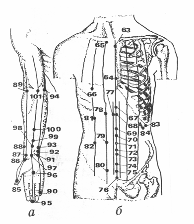 Ниже приводятся основные БАТ для воздействия на них точечным массажем при наиболее распространенных травмах и заболеваниях (рис. 1,2,3,4).