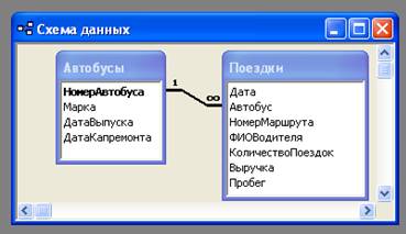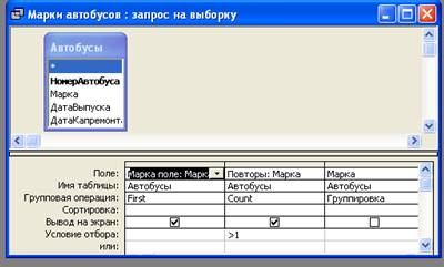 Так как в отчете требуется отобразить поля из двух таблиц, то перед созданием отчета, нужно создать запрос, включающий поля Номер автобуса и Марка из таблицы Автобусы и поля Дата, Выручка и Пробег из таблицы Поездки.