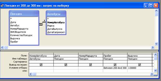 Введем условия отбора для поля Пробег Between 200 And 300, а для поля Выручка - >30000.