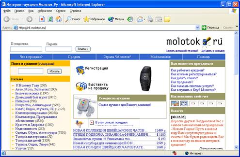 Откроем начальную страницу Интернет аукциона Молоток.Ру: