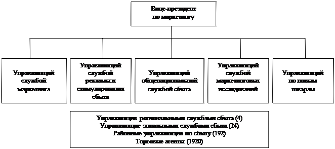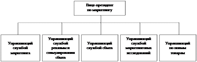 Самой распространенной схемой является функциональная организация службы маркетинга. В этом случае специалисты по маркетингу руководят разными видами (функциями) маркетинговой деятельности. Они подчиняются вице-президенту по маркетингу, который координирует их работу (рис. 2.1.). Кроме них, могут быть еще управляющий службой обслуживания клиентов, управляющий службой планирования маркетинга и управляющий службой товародвижения.