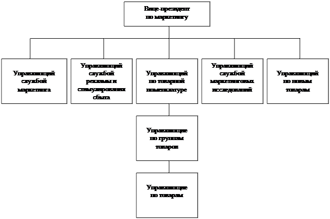 Фирмы с широкой товарной номенклатурой и/или разнообразием марочных товаров используют организацию по товарному или товарно-марочному производству. Организация по товарному производству не заменяет функциональной организации, а является еще одним уровнем управления. Всем товарным производством руководит управляющий по товарной номенклатуре, которому подчиняются несколько управляющих по группам товаров, которым в свою очередь подчиняются управляющие по товару, ответственные каждый за производство своего конкретного товара (рис. 2.3). Каждый управляющий по товару самостоятельно разрабатывает собственные производственные планы, следит за их выполнением, контролирует результаты, а при необходимости и пересматривает эти планы.
