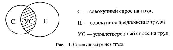 Главными составными частями рынка труда являются совокупное предложение (П), охватывающее всю наемную рабочую силу, и совокупный спрос (С) как общая потребность экономики в наемной рабочей силе. Они составляют совокупный рынок труда (рис. 1).