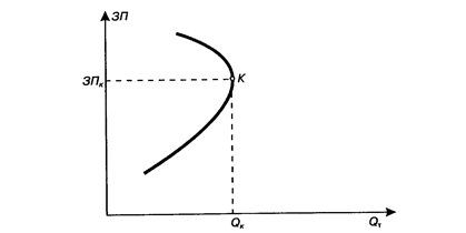 Предложение труда увеличивается под воздействием эффекта замещения свободного времени рабочим временем. Согласно эффекту замещения, каждый час свободного времени работником оценивается как упущенная возможность получения дополнительного заработка. Это возникает при недостаточной насыщенности потребностей работника. Поэтому при повышении заработной платы работник стремится к выполнению большего объема работ, что находит отражение в нижней от точки К части кривой предложения рабочей силы, представленной на рис. 4.