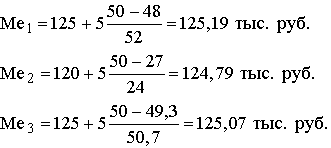 Таким образом, у половины предприятий уровень себестоимость единицы продукции превышает 125,19 тыс. руб., половина всего объема продукции производится с уровнем затрат на изделие больше 124,79 тыс. руб. и 50 % общей суммы затрат образуется при уровне себестоимости одного изделия выше 125,07 тыс. руб. Заметим также, что наблюдается некоторая тенденция к росту себестоимости, так как Ме2 = 124,79 тыс. руб., а средний уровень равен 123,15 тыс. руб.