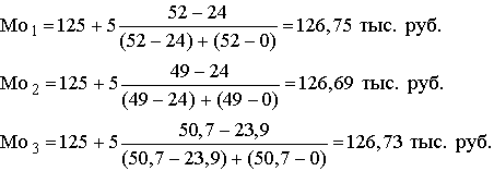 Для нашего примера можно рассчитать три модальных значения исходя из признаков числа предприятий, объема продукции и суммы затрат. Во всех трех случаях модальный интервал один и тот же, так как для одного и того же интервала оказываются наибольшими и число предприятий, и объем продукции, и общая сумма затрат на производство: