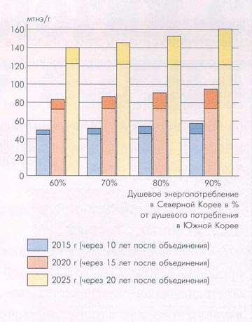 Проведенные нами расчеты основаны на предположении об объединении Кореи в 2005 году, при этом рассматривались сценарии достижения Севером через 10, 15, 20 лет после объединения уровней душевого энергопотребления, составляющих 60, 70, 80 и 90% от прогнозных значений этого показателя для Южной Кореи.