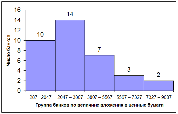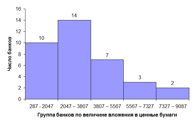 Значение признака, лежащего в середине ряда распределения – 3000 млн. руб., а наиболее часто встречающееся значение уровня вложения в ценные бумаги для данного интервального ряда – 2687 млн. руб. Среднеквадратическое отклонение показывает, что значение признака в совокупности отклоняется от средней величины в ту или иную сторону в среднем на 1962,27 млн. руб. Таким образом, средняя величина вложений в ценные бумаги, исчисленная по исходным (не сгруппированным) данным, составила 3233,69 млн. руб. Она отличается от средней, рассчитанной для полученного ряда распределения (3367 млн.руб.), поскольку считается по уже сгруппированным данным и по формуле средней арифметической взвешенной, а не средней арифметической простой.