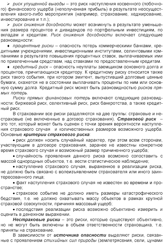 Понятие "риск" означает опасность неблагоприятно исхода на одно ожидаемое явление. Это гипотетическая возможность наступления ущерба. Всякий конкретный риск, например риск пожара, представляет собой только возможность наступления определённого неблагоприятного события (например возгорание застрахованных построек). Риск - объективное явление в любой сфере человеческой деятельности и проявляется как множество отдельных обособленных рисков.