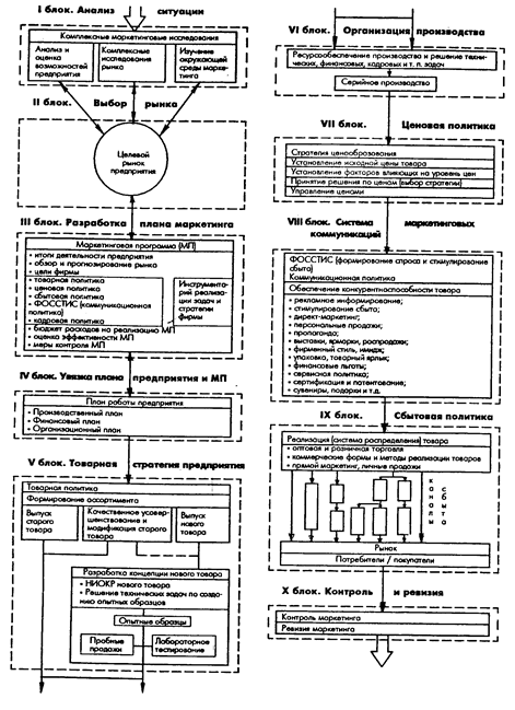 5. Формирование товарной политики (V блок), стратегии ценообразования (VII блок), системы маркетинговых коммуникаций (VIII блок), системы распределения товара (IX блок) - все это вытекает и основывается на маркетинговой программе предприятия и, если мы вынесли эти направления деятельности маркетинга за пределы МП, то только с целью того, чтобы придать им еще большую значимость и указать на то, что эти направления (планы МП) в процессе их воплощения в реальные действия, могут подлежать изменению, корректировке и т.п., видоизменяться под воздействием непредвиденных обстоятельств.
