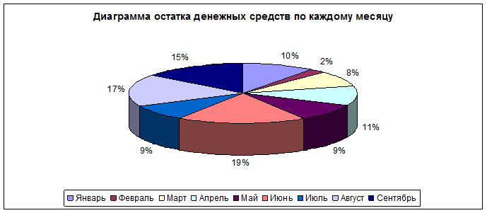 В меню выбирается Вставка-Диаграмма. В открывшемся Мастере диаграмм выбираем вид диаграммы, нажимаем Далее. На закладке Диапазон значений задаем диапазон значений из таблицы (столбец Остаток), записываем название ряда, задаем диапазон значений оси Х (столбец Месяцы). Нажимаем Далее. На закладке Заголовки задаем название диаграммы и подписи осей. На закладке Подписи Данных ставим пометку о включении в подписи долей. Нажимаем Далее, затем Готово.