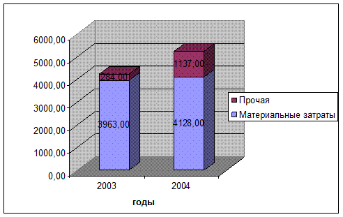 Как видно из рисунка 11, в организации в 2004 году наблюдался рост суммы себестоимости оказываемых услуг. При этом наибольшую долю в структуре себестоимости занимают материальные затраты (более 80 %).