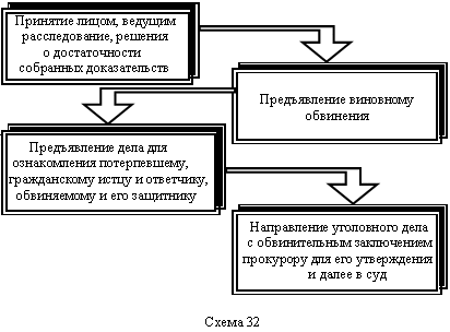 В статье 215 УПК РФ говорится о том, что следователь, придя к выводу, что все следственные действия по уголовному делу выполнены, а собранные доказательства достаточны для составления обвинительного заключения, уведомляет об этом обвиняемого и разъясняет ему предусмотренное ст. 217 и 225 УПК РФ право на ознакомление со всеми материалами уголовного дела как лично, так и с помощью защитника, законного представителя (схема 32).