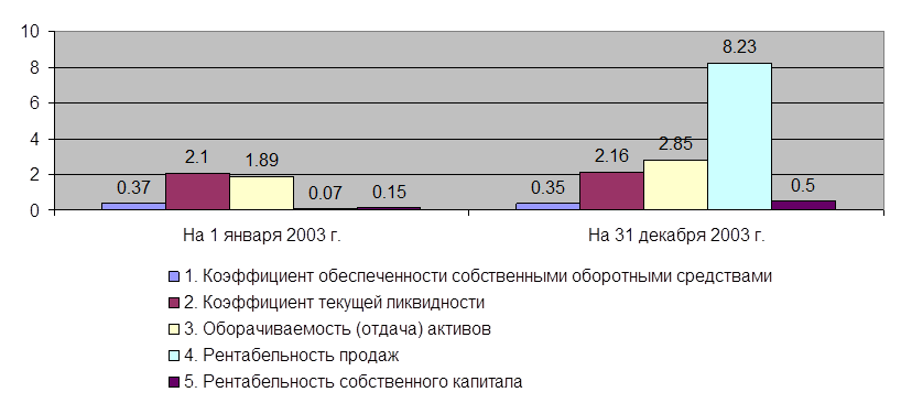 Все показатели, характеризующие ликвидность предприятия, находятся на уровне ниже нормы, кроме того, к концу 2003 года наблюдается их значительное снижение по сравнению 1 января 2003 г. Это свидетельствует о значительном ухудшении платежеспособности в концу 2003 г.