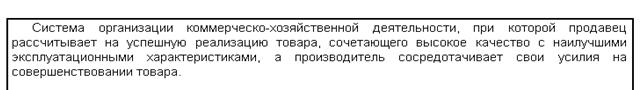 Она предполагает определенный курс действий товаропроизводителя, благодаря которым обеспечивалась бы преемственность решений и мер по формированию ассортимента, поддержанию конкурентоспособности товара, нахождению для товара оптимальных товарных ниш или сегментов и отсутствие такой политики ведет к неустойчивости структуры ассортимента, его подверженности воздействию случайных или переходящих текущих факторов, потеря контроля над конкурентоспособностью и эффективностью реализации товаров.