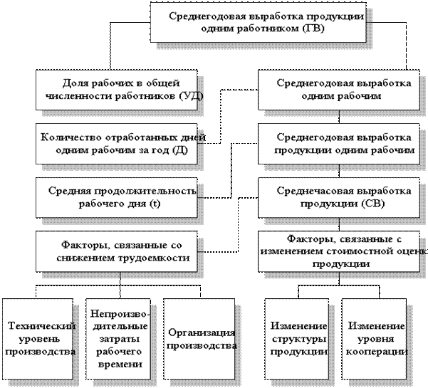 Обобщающий показатель производительности труда (выработка на одного работающего или одного рабочего) в значительной пени зависит от материалоемкости отдельных видов продукции, объема кооперированных поставок, структуры продукции. Более объективную оценку производительности труда дает показатель, исчисленный по чистой продукции, т.е. по объему продукции за вычетом материальных затрат и амортизации основных фондов.[4]