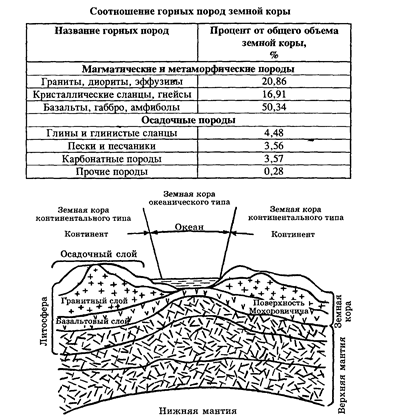 Литосфера (грея. “литое” — камень) — каменная оболочка Земли, включающая земную кору мощностью (толщиной) от 6 (под океанами) до 80 км (горные системы) (рис. 1.1). Земная кора сложена горными породами. Доля различных горных породе земной коре неодинакова — более 70% приходится на базальты, граниты и другие магматические породы, около 17% — на преобразованные давлением и высокой температурой породы и лишь чуть больше 12% — на осадочные (табл. 1.1).