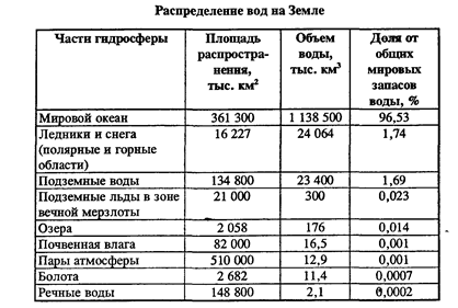 Более 98 % всех водных ресурсов Земли составляют солевые воды океанов, морей и др. Общий объем пресных вод на земле равен 28,25 млн км3, или около 2% общего объема гидросферы. Основная часть пресных вод сосредоточена в ледниках, воды которых пока используются очень мало. На долю остальной части пресных вод, пригодных для водоснабжения, приходится 4,2 млн км3 воды, или всего лишь 0,3% объема гидросферы.