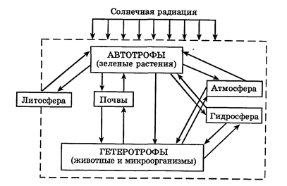 Биотическая часть состоит из живых организмов всех таксонов, осуществляющих важнейшую функцию биосферы, без которой не может существовать сама жизнь: биогенный ток атомов. Живые организмы осуществляют этот ток атомов благодаря своему дыханию, питанию и размножению, обеспечивая обмен веществом между всеми частями биосферы (рис. 1.2).