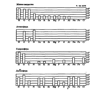 Рис 1.3. Участие различных химических элементов в построение живого вещества атмосферы , гидросферы литосферы(относительные числа атомов ) (по В.Лахеру, 1978 .Выделены самые распространенные элементы.