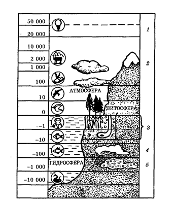 Рис.1.5. Распределение живых организмов в биосфере : 1- озоновый слой ; 2- граница снегов; 3- почва; 4- животные обитающие в пещерах; 5- бактерии в нефтяных водах ( высота и глубина дана в метрах )
