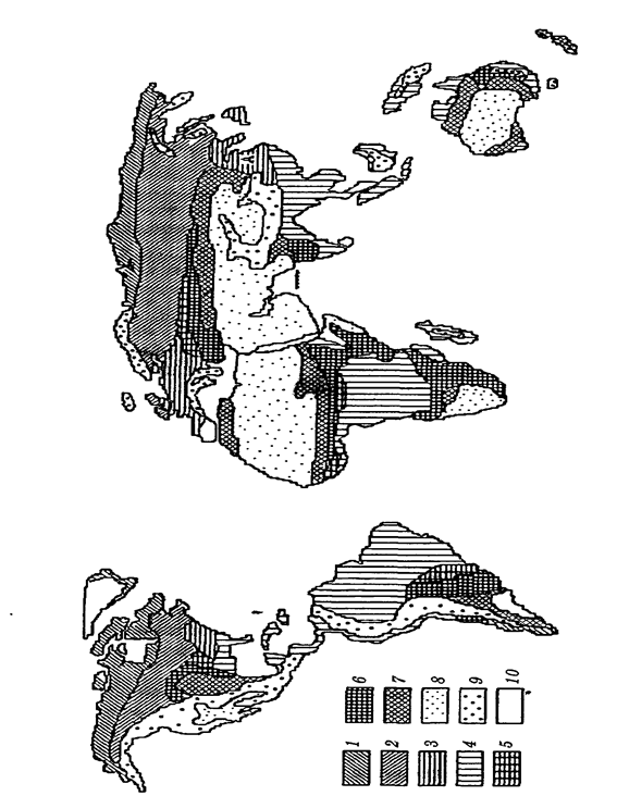 1- тундра, 2- подзолы, 3- серо-бурые подзолитстые почвы , бурые лесные почвы и тд , 4- латеритные почвы, 5- почвы прерий и деградированные черноземы, 6- чернозёмы ,7- каштановые и бурые почвы 8- сероземы и пустынные почвы, 9- почвы гор и горных долин 10- ледяной покров