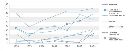 Рис. 3.3. Динамика инвестиций в основной капитал в некоторых отраслях промышленности в 1998-2004 гг., млн. долл. США