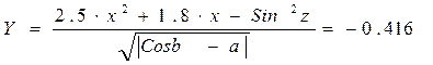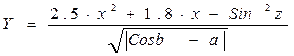 20 Y = (2.5 * X ^ 2 + 1.8 * X - SIN(Z) * SIN(Z)) / (SQR(ABS(COS(B) - A)))