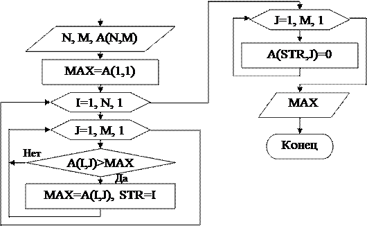 Найти максимальный элемент матрицы A(N,M) и записать нули в ту строку, где он находится..