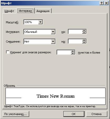 - поле для задания значения пунктов. Этот элемент позволяет путем использования стрелок вверх и вниз увеличивать или уменьшать значение пункта. Данное поле может быть отредактировано, то есть можно ввести произвольное значение. Причем необходимо заметить, что поле выбора интервала заполнится автоматически в зависимости от введенного значения пункта. 0 соответствует обычному интервалу, отрицательные значения – уплотнению, а положительные – разряженности символов.