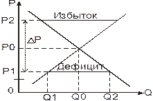 Пусть в начальный момент времени цена равна P1. Тогда Q1>Q2. Существует некоторое избыточное предложение Q1 – Q2 = A. Для того, чтобы продать А, нужно уменьшить цену. Пусть начальная цена равняется P2. В этом случае Q1>Q2 – избыточный спрос дефицит. Возникает желание увеличить цену.