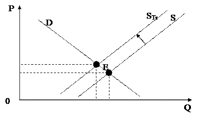 Если в страну импортируется какой–то товар, то есть цена, по которой иностранная фирма готова его предложить. Государство же из соображений пополнения казны, защиты интересов национальных производителей, может вводить наценки к новым товарам – тарифы. На рисунке показан эффект введения тарифа на товар (он аналогичен ситуации с налогом от продаж)