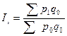 Если нам надо рассчитать соотношения цен по набору товаров, то выбор и расчет соответствующих показателей (индексов) усложнится. В этом случае надо вначале определить, каков состав набора товаров и как рассчитать средние цены, ибо с изменением структуры реализуемых товаров изменятся их доли (веса) в наборе, а затем избрать наиболее приемлемый метод подсчета ценовых индексов (от метода подсчета зависят показатели роста цен). При подсчете ценовых сдвигов обычно используют два метода. Один из них основывается на применении индекса (формулы) Ласпейреса: сравниваются цены текущего периода (p1) и базового (p 0) на одинаковый набор товаров (товарную корзину) (q0). Формула Ласпейреса показывает, на сколько фиксированная товарная корзина становится дороже в текущем периоде.