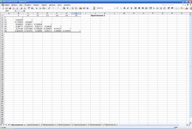 Анализ значений парных коэффициентов корреляции между факторами Х1, Х2, …, Х6 показывает, что только коэффициент корреляции между парой факторов Y –Х6 превышает по абсолютной величине 0,8 (выделен в таблице жирным шрифтом). Факторы Y –Х6, таким образом, признаются коллинеарными.